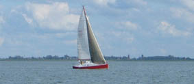 Inmiddels heb ik uitgepuzzeld hoe ik het beste de haven kan binnenlopen zonder op een van de tientallen onverlichte staken te varen. Ik heb het niet op Urker vissers en niet op Urk en mijn vooroordeel wordt hier weer bevestigd. Dit lijkt het verkeerspark in Assen wel! Mijn ligplaats is ook al niet je dat, ik lig te rijen aan de passantenkade in de havenmond. De wind stuwt de golven recht de haven in. Ik zet het roer vast, klem vier stootwillen tussen het schip en de zanderige kade en hoop er het beste van. Ik maak nog een praatje met de schipper van de Cygnus en bel mijn vriendin, die prompt vraagt wanneer ik nou op hou met die onzin. Zij respecteert mijn hobby, maar dit vindt ze zwaar overdreven. Na deze peptalk maak ik maar een biertje open. Ik ben nog steeds niet tevreden over mijn zeilprestaties, na twee dagen heb ik 63 mijl afgelegd. Vrijdag Hoop doet leven Het is een beetje heiig, maar wel droog als ik vertrek. Vlak voor mij uit vaart de Cygnus en deze loopt langzaam van mij weg. Ik baal ervan dat ik geen groter zeil dan mijn genua kan zetten. En er staat wat meer wind dan gisterenochtend. Het hele rak naar de Sport B is voor de wind, dus ik zet de genua ver uit met de spiboom. Erg hard gaat het allemaal niet.