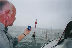 - Ben erg benieuwd, hoe dat bij de boeien moet. In de ene hand de camera, in de andere de gps-unit. En kijken door de zoeker van de camera, tegelijk een gijp om de ton inzettend, al of niet met de spi hoog. Gelukkig heb je steeds een heel rak om te overdenken, welke handeling eerst moet en welke tegelijk. Alle gekheid op een stokje. Ik ben bang, dat het bij de boeirondingen hard werken wordt. Hoe lang doet de gps-unit gemiddeld erover, om van groen knipperend rood te worden? Bij hardere wind kom je toch al handen tekort, bijvoorbeeld bij het door de wind gaan tijdens de boeirondingen, hetgeen regelmatig voor komt.