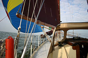 - Als de spi staat, blijkt de stuurautomaat het allemaal niet aan te kunnen. Dus sleept de zeilzak van de spi door het water en moet ik noodgedwongen de fok laten staan.