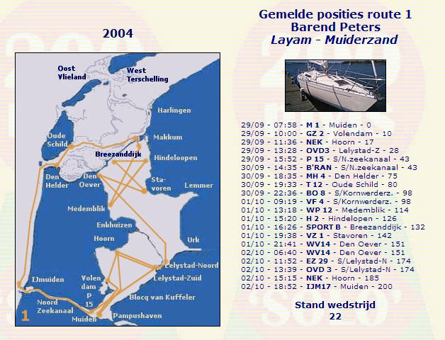 Na het schutten ga ik naar Aeolus. Ik krijg een box toegewezen en ruim wat op. Als ik ga zitten om een broodje te smeren, zak ik onderuit en wordt een uur later weer wakker van de telefoon. De laatsten zullen de laatsten zijnWelgemoed stap ik 13 oktober in de auto voor een ritje van 20 kilometer. Wat ik gemist heb, is dat er op de rondweg een totale verkeerschaos is ontstaan door een gekantelde tankwagen. Doorijden ho maar. Als ik dan om 21.00 binnenloop, zie ik de toepasselijkheid er wel van in. Als een van de laatsten gefinished, als een van de laatsten in het clubhuis. Gelukkig nog net op tijd voor het officiële gedeelte. En in 2005? Ik denk niet alleen met positieve gevoelens terug aan deze 200 mijls. Ik heb nl. een staatje gemaakt net daarin de prestaties van een aantal deelnemers met dezelfde rating die ook route 4 gezeild heeft. De cijfers spreken voor zich. Mijn gemiddelde snelheid over het gemeenschappelijke traject (M1 – OVD3) bedroeg 3,65 knopen, die van de vergelijkingsgroep hele traject bedroeg 3,52 knoop, die van de controlegroep 5,45. Dat is treurig. Gelukkig deed ik het op route 4 iets beter, mijn gemiddelde snelheid bedroeg daar 3,91, terwijl de controlegroep daar met een gemiddelde van 4,45 iets minder presteerde ten opzichte van het eerste deel.