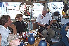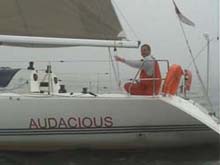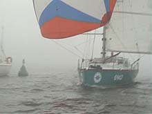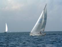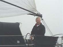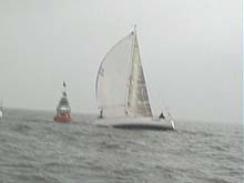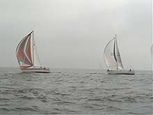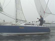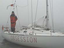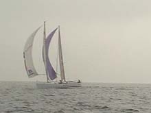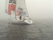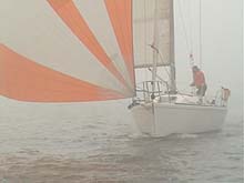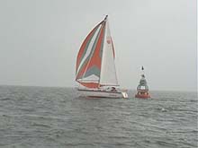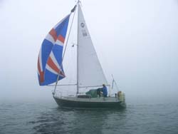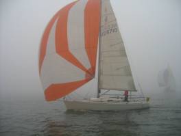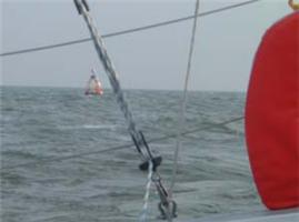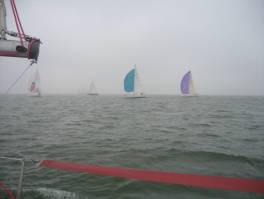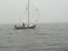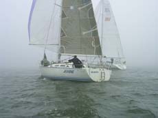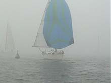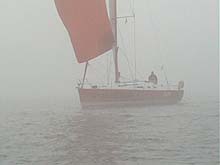 De wind is aanvankelijk 2 maar neemt snel toe naar 3 a 4 Bft. Zowel spinakeren als de dagelijkse gang zijn te riskant met dit zicht van 1 tot 4 km, de eerste laten we dan ook achterwege en het tweede verwijnt rechtstreeks achter de hekstoel.