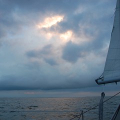 Het was nog donker toen ik weer verder ging. De spi mocht weer werken. Met zwakke wind en met tij mee naar Kornwerderzand. Mooi en vlak water. Uitgerust kon ik beginnen aan de rakken op het IJsselmeer. Met een lopende wind naar Medemblik en naar Hindeloopen. Daarna met zwakkere wind opkruisen naar Breezanddijk. Rond kwart voor acht ’s avonds begonnen aan het laatste rak voor die dag. Het begon zo mooi: spi erop en varen maar! Alleen die wolkenpartijen in het NW bevielen mij niet echt. In korte tijd trok de wind aan. Als de bliksem de spi eraf. Helaas trok de spinakerval de sluiting van de grootzeilschoot los. De spi trok ik achter het grootzeil naar binnen toe. De giek schoot naar voren tegen het want. Snel halve wind gestuurd en het grootzeil gestreken. Daarna, het woei inmiddels 28 knoop weer richting Staveren gestuurd. Met een hulplijn de giek weer midscheeps getrokken en de schoot weer bevestigd. De wind was verder aangetrokken tot ruim boven de 30 knoop. De golven bouwden op en alleen op de kale mast liep het schip 5 knoop. Ik liet het maar zo. Eerst moest ik nog de LC6 passeren. Daarna op motor , zeilen was niet mogelijk ( stik in de wind en zware zeegang) naar Staveren Ik had twee uur nodig voor die 3,4 NM. Binnen werd ik geholpen met afmeren door de Viento die net voor mij binnen was gekomen.