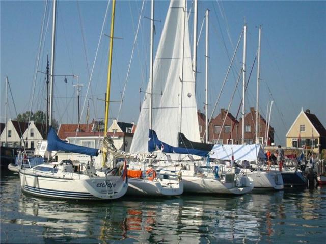 De haven van Durgerdam ligt lekker vol en ik kan een prima plaatsje vinden. Leuk om collega deelnemers weer te treffen. Zoals gebruikelijk wordt er op de steigers gesproken over baankeuze’s en windverwachtingen. Dat laatste was zorgelijk want de voorspellingen zijn ongunstig. Hoofdzakelijk een zwakke tot lichte wind uit het zuid oosten. Dat deed mijn denken aan de uitspraak van mijn moeder. Ook zij heeft jaren gezeild en vertelde dat elke wind wel iets had. “Een west kruipt vroeg in z’n nest, een oosten wind zet s ‘avonds door” Maar een zuid oosten wind, zo vertelde zij is geen wind, daar kun je niet op aan.