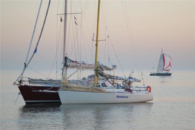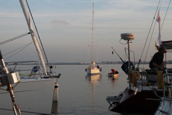 We slipped anchor at dawn (a poetic turn of phrase for hauling up the muck-covered anchor) and after passing through the Lelystad locks to the Markermeer, Rebellion loitered around the starting buoy and waited for wind. Two other solo boats joined Rebellion, our passing friend from the first night, Majic Potion, and the X-35 Fast Fox. The two others set off shortly before Rebellion on the spinnaker run in what turned out a prescient decision. The wind dropped quickly as the three boats approched the Hoorn buoy, with Majic Potioncrossing first and electing to make a rest stop, Fast Fox taking a half hour to make up the several boat lengths to cross the line, and Rebellion painfully creeping over with 0.2 knots boatspeed another half hour later. Rebellion elected to continue on the second to last leg form Hoord to Volendam, a short journey that normally takes around 90 minutes but in the dead air took 5 hours. The last 200 meters took an hour, amid pleasure boats at anchor with kids and teens frolicking in the water. We again came upon Leef Je Droomnear the buoy, and after rounding early Saturday afternoon both boats elected to take a rest in Volendam until the wind picked up.