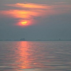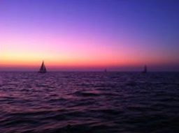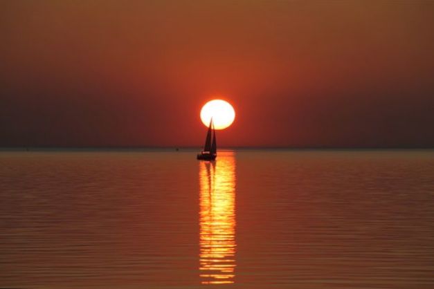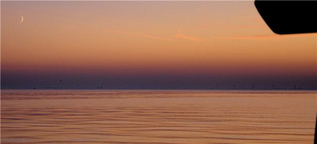 Na de laatste slok brandt licht aan stuurboord de hemel rood op met purper roze wolken. Aan bakboord, de westelijk hemel, is het rood roder en zwaarder. Als de zonder verder zakt begint het water te glimmen in rood en paars, zo mooi, dat ik niet weet hoe veel ik hier van op moet zuigen. Het is de eerste van 4 hele mooie avond hemels waarbij het laatste daglicht een wonderlijke kleurendans opvoert. Als het water, 2 dagen later, geel en blauw opvlamt vraag ik me bezorgd af of ik toch niet meer moet slapen. De kleurendans verzadigt in een donkere zwarte band op de horizon. Aan de bovenzijde is het zware rood, daarboven oranje geel dat verfletst in helder licht blauw. Zwart-rood-geel, is dat niet de Duitse vlag, bedenk ik ineens, maar dan op zijn kop? Bedoelen ze dat met het avond land?