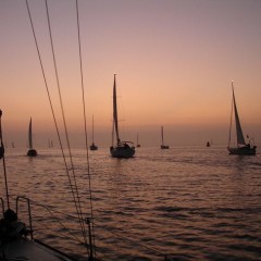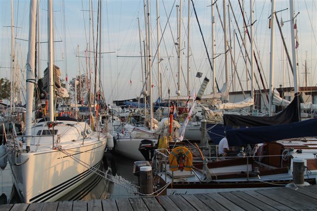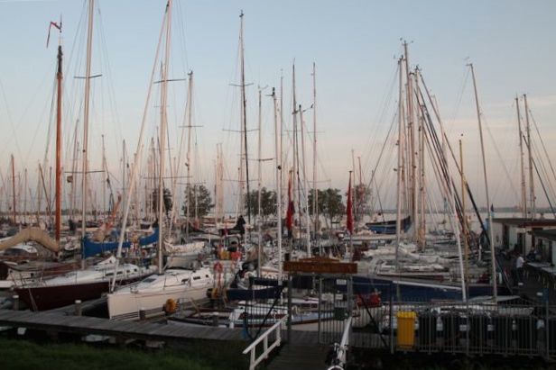 The sea was flat, there was still a modest wind (should I have continued on Coarse 1?), and the sunset was magnificent as good progress was made northwards under spinnaker. It was also a new moon as darkness fell, the Milky Way lay across the sky, and the only fear was catching a fishing pot or running into one of the many unlit buoys on the inland sea. We rounded the course buoy at the very north end of the Ijsselmeer in late evening, and tacked back toward Enkhuizen for the first rest period. Near midnight we saw mast lights passing nearby and popped below to check the chartplotter; the AIS [a boat identification system] showed the boat as fellow solo sailor Arjen on Majic Potion, on another leg and course. After a half day we finally saw another of of our fleet, albeit only in passing. Near midnight we rounded a course buoy near Enkhuizen, and decided to make the first rest stop. There was little internal debate, even though the wind held light but steady, and at 1 am we rafted up to another boat in old Enkhuizen harbor — a somewhat unappreciative German couple. After a hasty cup of soup and sandwich we enjoyed six hours in a coma down below.