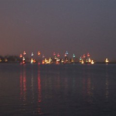 Eenmaal buiten liggen de rode en groen lichten in duidelijke paren. Aan de helderheid van het licht concludeer ik welke poort het dichtste bij is. Daar stuur ik op af. Slingerend door de geul met stroom mee. Bij boei VG 17 zijn grootzeil en spinaker weer gehesen, de motor gestopt en ik weer in de race. Na een dik uur, de lichten van Den Helder zijn al duidelijk zichtbaar, duikt aan bakboord opeens een zwarte schim in het water op, vlak naast het schip. Ik wil uitwijken naar rechts, maar daar is net zo’n schim. Shit, ik vaar dwars door een mosselveld. Overdag zijn het lange slierten aan elkaar gebonden blauwe Jerrycans. Nu lijken het lage dijkjes. Ik kan allen rechtuit blijven varen. Is daar een opening?