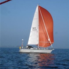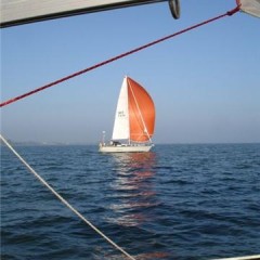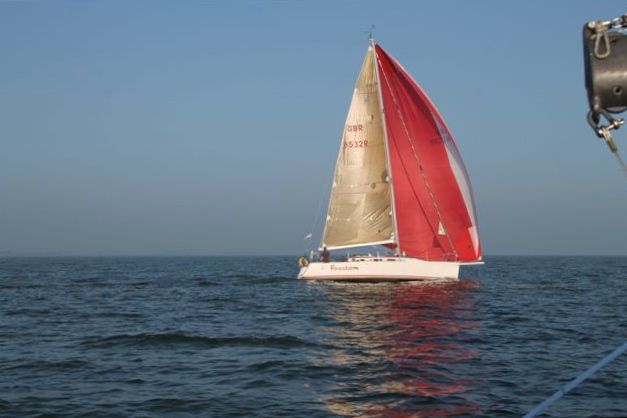 Deze eerste ochtend is meteen het feestelijkst. Alle schepen zijn nog van de partij, hun gekleurde spinakers als vlaggen op het water, zonneschijn en een vriendinnenwindje mee. Ik zet de stuurautomaat aan en speel zelf met de schoten van de spinaker om steeds maximale snelheid te kunnen maken.