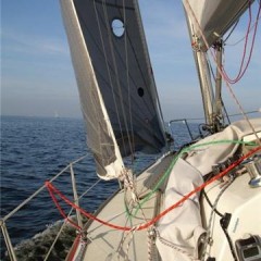 The southerly wind allowed a spinnaker start, followed by two other spinnaker legs as all boats worked north on the shared early part of the course. With a moderate breeze Rebellion’s big blue and white light spinnaker filled out and in the first hours she overtook a number of the smaller early starters. Near Volendam the course angled further north and it was time to gybe. As noted all to often below, this can be a problematic maneuver even with a full experienced crew, a further challenge double-handed, and requiring careful execution and perhaps a favorable hand from above when solo. In a jibe the boat direction is changed so that the wind direction shifts from one aft quarter to the other. For boats with assymetrical spinnakers that attach to a fixed pole form the bow, the sail is shifted from one side to the other like a big genoa. For boats with traditional spinnakers like Rebellion, the spinnaker pole must also be moved from one side to the other. With a full crew this is done by quicky detaching the outboard end of the pole from the spinnaker and dipping the pole down, attaching the line from the other end of the spinnaker, and then swinging the pole over and up on the other side. Short-handed this is easier done by letting the pole hang from a line and then switching ends of the pole at the mast.