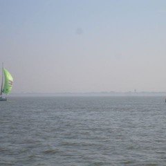 Het gemiddelde is niet meer belangrijk, dat is vannacht bij Urk al om zeep geholpen, maar binnenkomen is op zich al een prestatie. Even lijkt met het weg zaken van de zon wat wind te komen maar meer als twee zuchtjes zijn het niet. En al die ganzen die een nacht verblijf zoeken gakken er rustig oplos. Tegen elfen is de GZ2 in zicht, een klein beetje wind uit het Noordwesten doet mij de spinnaker weer hijsen. Om de boei komt de wind weer uit het zuidoosten dan wordt hij zuid dus alles na het gijpen ook maar weer weggehaald. Vlak voor het Paard van Marken een zuchtje uit het zuidoosten, weer wordt de spi gehesen en zo ronden we hoopvol het eiland. Maar alle hoop vervliegt en de spi wil niet staan zo weinig wind is er. Bij Uitdam komt er mist opzetten. Dit brengt een klein beetje wind uit…. het noorden, spi weg en een knik in de schoot. Ik glijd richting de P9. Nu heb ik om de een of andere stomme reden deze niet goed in de GPS staan. (3082 mijl is te veel) dus heb ik de P11 in gegeven. Die ligt iets verder maar als ik deze onderhaal loop ik vanzelf op de P9.