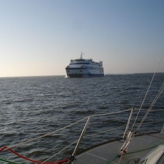 Dit jaar heb ik waarschijnlijk ook een magneet voor beroepsschepen aan boord. Na de passage van de BO 44 bij Harlingen moet ik door de “Boontjes”, diepte op de kaart 1.30, en met een diepgang van 2.21 kritisch een 2 tot 3 uur voor hoog water. Komt er precies een lege giga coaster vanuit Harlingen mij achterop die me net op het smalste stuk van de Boontjes wil passeren, ik kan niet opzij, dan loop ik zeker vast, na overleg over de marifoon blijf hij even achter me. Is maar goed, als je ziet wat een zuiging dat schip op dat ondiepe stuk geeft, is vastlopen een zekerheidje.