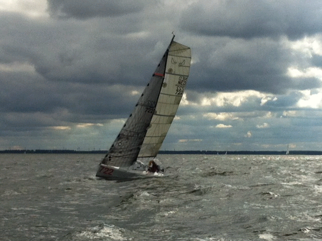 Het laatste lesje kreeg ik nog voor de start van de laatste 3 trajecten Markermeer naar de finish. Zondagmorgen 07.30, wind ONO 20-25kts , volgens Expedition moet de 26,5 mijl in 3 uur gevaren kunnen worden. Ik heb me al dagen verheugd op het rak van Lelystad naar Hoorn bij deze wind onder deze hoek. De A5 van 109m2 er op en knallen maar. Dus zo gezegd zo gedaan, de A5 mooi gewold in de zak, klaar aan dek, de genua #3 op om rustige hoist te hebben. Op 0,5 mijl van de OVD3 alles klaar en op snelheid langs de boei, dat is het plan. De werkelijkheid: ik hijs de gennaker in top en klik hem aan de mast vast in de curryklem en ik loop naar de kuip om het val door te halen in de valstopper, compleet volgens plan. Echter voordat ik daar ben schiet het val uit de curryklem en valt de hele gewolde A5 met een plons naast de boot, shit shit, snel weer naar de mast en weer hijsen. Vervolgens zie ik aan lij mooi de wolletjes van de gennaker afbreken en het geheel zich vullen met grauw IJsselmeer water. Ondanks mijn verwoede hijspoging verlies ik de strijd en moet het val slippend en rokend door mijn handen laten gaan. De hele 109m2 hangt nu als een gigantisch drijfanker naast de boot terwijl ik prachtig met nog maar 1,5 knoop snelheid op de OVD3 afga om in te klokken! Verwoed probeer ik wat af te vallen om in ieder geval niet in te klokken, wat gelukkig lukt. Nu nog dit monster aan boord zien te krijgen. Het geheel zit op 3 punten vast en blijft zo prachtig gevuld met water terwijl ik voor de wind wegsukkel. Gelukkig verschijnt de top van de gennaker soms achter en naast de spiegel van de boot en kan ik de shackel van het spi val spiken. Dat scheelt meteen, het wordt nu al een beetje een lange dweil, alleen aan boord halen is nog geen optie. Na ook de tack gespiked te hebben hangt het geheel als een worst aan de schoot naast de boot. Ik weet met veel moeite het natte monster stukje voor stukje aan boord te halen, hij lijkt me nog heel. Na een 15 minuten alles weer aan boord, ik ben nu al kapot en ik moet nog beginnen! Ik besluit eerst maar zonder gennaker te starten gezien de tijdsdruk en de tijdelijke fysieke gesteldheid, en ik moet voor 12uur finishen. Na gestart te zijn zie ik Sander van Doorn op de AIS met 10,5 kts over het Markermeer scheuren en vervolgens weer 5 kts maken, hij heeft het verderop duidelijk zwaar. De wind neemt snel toe als ik uit de schaduw van Lelystad ben en meet in no-time 28kts wind. Nu had die A5 ook niks geweest, misschien heb ik nog wel geluk gehad dat ik ‘m niet kon zetten. Met uitschieters boven de 12kts boatspeed spuit ik naar Hoorn, draai voor de zekerheid een stormrondje bij de Sport G om alle risico te vermijden en blijf nu voor de zekerheid wel ver uit de wal en finish uiteindelijk om 11.09 bij de P9, rondje Markermeer binnen 3 uur en 2 minuten, niet slecht.