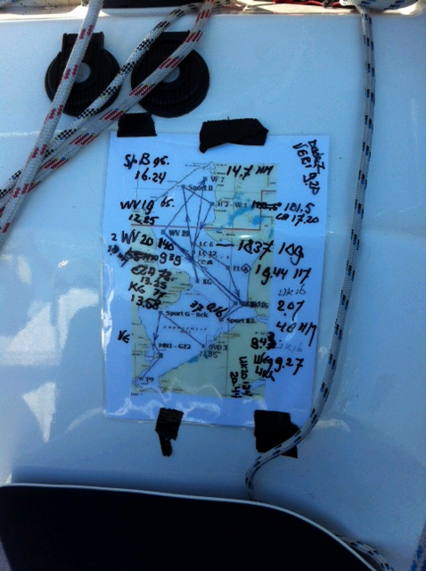 Na wat gesleutel en @#$%@, de kabel uiteindelijk los gekregen en weer op blok teruggeplaatst en kabel weer onder spanning gebracht. Ready to go! Nu de 6 uur ankertijd vol maken, snel nog wat uurtjes slaap geprobeerd. De wind blijft aardig door staan en gekeken wat de concurrentie doet. Richard kiest voor baan 3, ook Martin die nog even komt buurten gaat voor 3, mijn keus is gemaakt voor baan 1, al vastgelegd door mijn stuurboordronding bij de OVD3. We zullen de komende dagen zien welke baan de juiste was, ik kies voor het stroomvoordeel t.o.v. iets meer kruisen. Uiteindelijk vaar ik zodoende theoretisch een baan van slechts 190 mijl door 10 mijl stroom mee.