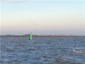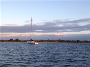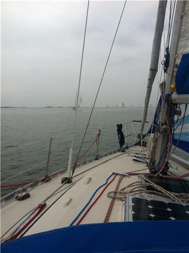 Om 10 uur lag ik vast in Lelystadhaven. Ik had geen zin meer om in het donker op het voordek te rommelen en mijn anker te laten vallen. Het was best een lange dag geweest. Nu weer uitgerust op weg naar de sluis. Er is wind en zon. Wat wil je nog meer. Het begon met een pittige wind, die zorgde voor erg knobbelig water bij de sport F. En dan al die enge visstokken waar je inkomt als je pech krijgt. Brrr. Maar gelukkig ging de start daar vlekkeloos. Net op tijd de motor uit. En al snel een rif gezet. Dat kon er uit bij de SB-B en ging er bij het volgende aandewindse rak weer in. Heerlijk om eens 7 knopen op het log te zien.