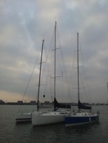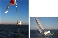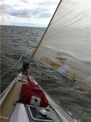 Tijdens het schutten door de Houtribsluis viel me een los draadje met shackle op halverwege mijn mast. Dat zou wel eens van mij kunnen zijn denk je dan. En jawel: de spiboomophouder was na het bergen van de spi losgeschoten en op weg naar de sluis had ik in het donker de diverse lijntjes in de kuip wat doorgehaald. Na het schutten met vier knopen op de motor dus eerst even de mast in onderweg naar de startboei. Met behulp van een val, bootsmanstoeltje en twee klimijzers van Petzl (bergsportzaken hebben dit) was binnen drie minuten het leed geleden en de lijn weer terug aan dek. Altijd handig dat ook dit solo lukt.