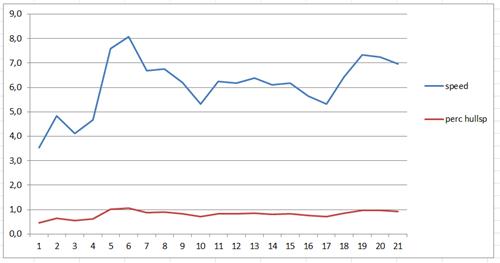 Zoals uit het plaatje blijkt: Veel rakken op of over de rompsnelheid gevaren.