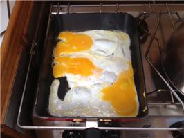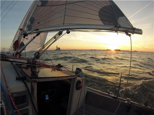 Het is 6 uur en ik lig al een uur wakker. Het is doodstil in de haven, terwijl hier toch bijna 100 boten extra liggen. Wat gaat het worden vandaag? Weinig wind, dobberen dus! Tja, en blijf ik dan eerst 6 uur liggen of toch maar vertrekken? Ik denk het laatste, want dan ben ik in ieder geval iets aan het doen. Nog een uurtje in bed sudderen en dan maar eens kijken hoe het zicht is. Dat is nu nog prima. De kriebels om te starten wonnen het van het verstand. Twee buurboten maakten de weg vrij om te vertrekken. Het was nog donker. Leuk! Er stond 3 knopen wind, maar het lukte om op zeil langs de P9 te glijden. Het is heerlijk rustig op het water en ik overweeg de Genaker te zetten. Ik ga het maar doen! De wind is al een poosje weg, maar ik ga toch heel zachtes vooruit. Er is niet veel te doen dus. Een beetje kijken naar twee tegenstanders gaat ook vervelen. Vandaar dat ik nu een lekker eitje aan het bakken ben om de tijd te verdrijven. De track en trace doet het nog niet. Jammer voor mijn fans.