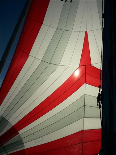 Het was nog een hele klus om het zeil te bergen en er een ander op te zetten. Voortaan alleen maar een high aspect???