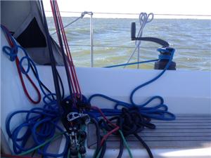 Achteraf een gelukkig besluit, als ik de volgende morgen de boot uitvoerig naloop in voorbereiding voor de laatste rakken op het Markermeer blijkt dat toen gisteren de gennakerschoot onder de boot kwam bij de laatste drop en ik hem opnieuw in de blokken moest doorvoeren aan lij, ik de SB gennakerschoot per ongeluk door de voorpreekstoel gevoerd had, ondanks check, check, double check. Als ik dus in dat rakje EZ1-SportF nog even snel de genny gezet had…puinhoop. Vermoeidheid?