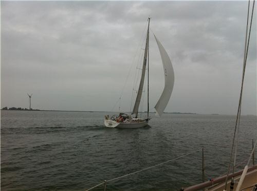 In de sluis van Lelystad sluiten Gert Jan en ik aan bij de Batfish van Bart. Niet slecht want Bart is een kwartier voor mij gestart. Met zijn drieën zeilen we van de Sport F naar Urk. Prachtig zeilen zo in de nacht en een heerlijk windje. Ook in dit rak blijf ik de Swinde voor. Om 2.30 meren we af in de haven van Urk. ’s Morgens niet te vroeg op want ik wacht tot de wind naar het NO draait. Heerlijk gedouched en ontbeten en om 9.45 starten we samen met Gert Jan voor het vervolg. Bart is na de verplichte 6 uur rust gelijk weer vertrokken. Hij zeilt zeker voor Line Honours. Met wind tussen 12 en 18 knp zeilen ik de hele donderdag achter Gert Jan aan. Het is duidelijk te zien dat de Swinde met meer wind beduidend sneller is dan mijn kleinere Dehler 34. De gehele donderdag vaar ik achter de Swinde aan. Bij een boeironding van Gert Jan bekijk ik telkens wat mijn achterstand bedraagt. Die blijft redelijk constant. Echter op het rak naar de Sport B loopt Swinde echt bij me weg. Gelukkig kan ik wat goed maken in de twee ruime en voorde windse rakken. Als ik voor de tweede keer van Urk naar Oude Zeug vaar, het is inmiddels nacht geworden, kost het mij veel moeite om de spi te zetten. Telkens als ik denk dat mijn stuurautomaat de koers vasthoud blijkt deze zijn eigen koers te willen bepalen. En zet ik de spi in etappes. Eerst de spi naar voren, vervolgens aanslaan, de loefschoot, de lij schoot etc. en tussendoor telkens de boot weer even op koers leggen. Ik ben kapot maar blij als de boel staat. Er af is van later zorg….. eerst wordt de achtervolging op de Swinde ingezet. Ik zie gelukkig het toplichtje van deSwinde helderder worden, dat is een goed teken. Als ik zie dat Gert Jan een rust periode bij de Oude Zeug neemt wordt ik helemaal blij. Het rak naar Makkum is bezeild en Ik vaar met 7,5 knp naar de VF 7. Om 3.30 laat ik het anker vallen voor Makkum. Lekker slapen.