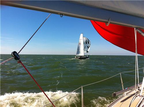 Ik realiseer me nu dat ik wel kans kan maken, het loopt super, veel gennakerwerk onder mooie hoeken, veel rakken haal ik net, met m’n 120m2 gevaar in top, wel hard werken maar ’t loont. Het laatste rak van de EZ1 naar Sport F besluit ik het lot niet te tarten, hoek is net goed maar ik zet mijn gennaker niet omdat de Sport F slechts een paar honderd meter van de dijk ligt, heb je een probleem met de spi drop, dan is het hele verhaal over, dus we gaan maar op safe.