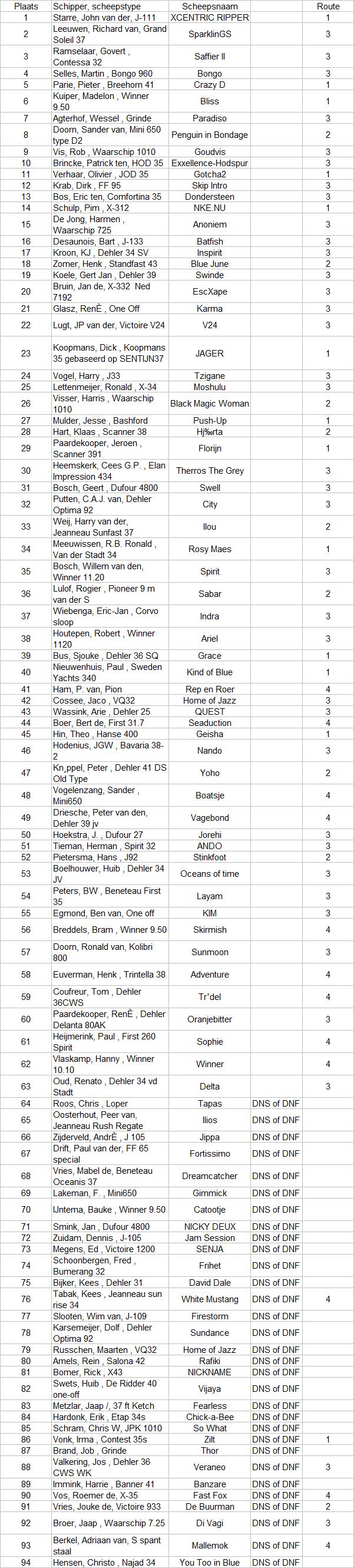 Vanwege de verwachting van weinig wind en verhinderingen verschenen er uiteindelijk weinig starters in Durgerdam. Er waren uiteindelijk 94 betaalde inschrijvers, 74 starters. Doordat er weinig uitvallers waren, hebben maar liefst 63 deelnemers de wedstrijd uitgezeild. Geduld werd beloond. Deelnemers die laat gestart zijn vanuit Durgerdam, of die bij weinig wind rust namen en alleen zeilden bij voldoende wind, werden beloond voor hun strategie. Banen 1 en 2 zijn over het algemeen populair vanwege de stroom die je mee krijgt, maar ze bleken dit jaar lang zo gunstig niet als eerdere jaren, omdat de windrichting leidde tot relatief veel kruisrakken.